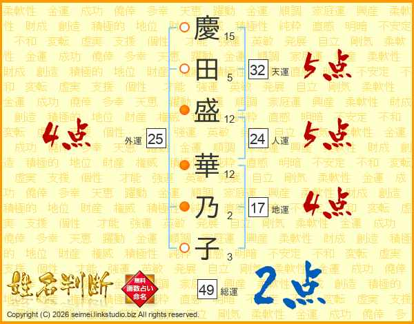 慶(15画)田(5画)盛(12画) 華(12画)乃(2画)子(3画)
