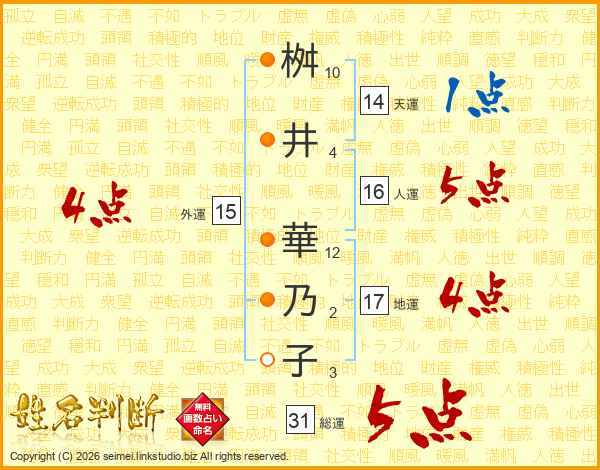 桝(10画)井(4画) 華(12画)乃(2画)子(3画)
