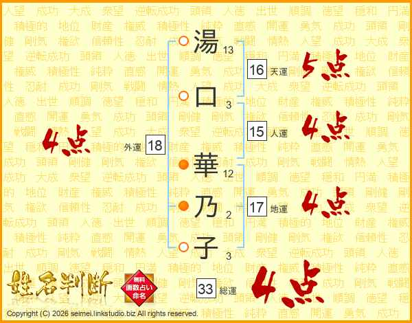 湯(13画)口(3画) 華(12画)乃(2画)子(3画)