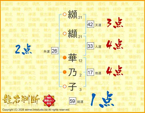 生活面を象徴する運勢です。外部から受ける影響力を表し、結婚運、家庭運や職場、環境への順応性を表します。総運から人運を引いた画数。姓や名が1文字の場合を除く。