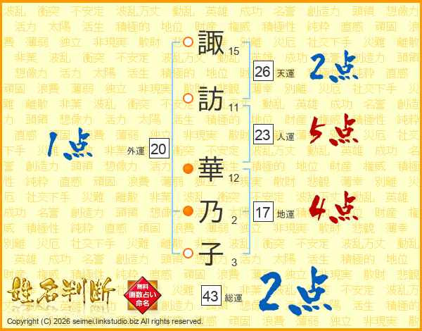 諏(15画)訪(11画) 華(12画)乃(2画)子(3画)