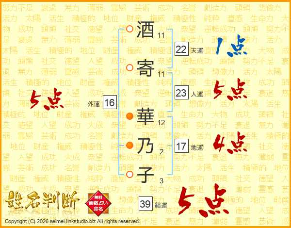 酒寄華乃子さんの総運は39画の5点!