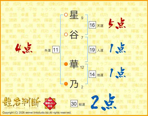 生活面を象徴する運勢です。外部から受ける影響力を表し、結婚運、家庭運や職場、環境への順応性を表します。総運から人運を引いた画数。姓や名が1文字の場合を除く。