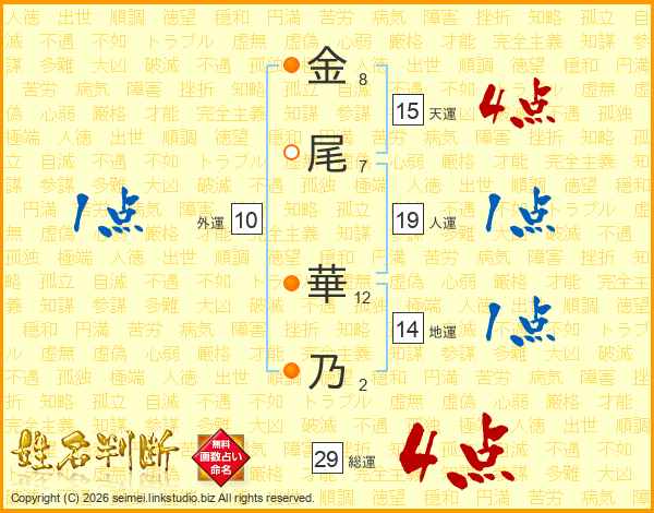 生活面を象徴する運勢です。外部から受ける影響力を表し、結婚運、家庭運や職場、環境への順応性を表します。総運から人運を引いた画数。姓や名が1文字の場合を除く。