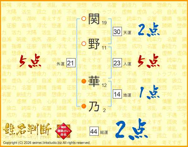 生活面を象徴する運勢です。外部から受ける影響力を表し、結婚運、家庭運や職場、環境への順応性を表します。総運から人運を引いた画数。姓や名が1文字の場合を除く。