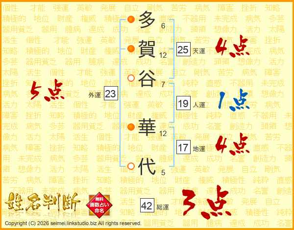 多(6画)賀(12画)谷(7画) 華(12画)代(5画)