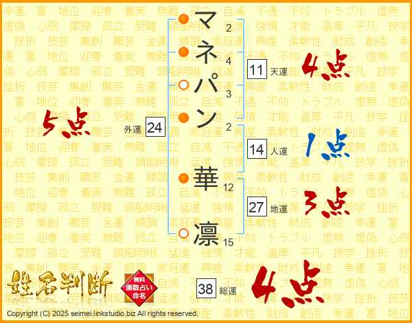 マ(2画)ネ(4画)パ(3画)ン(2画) 華(12画)凛(15画)