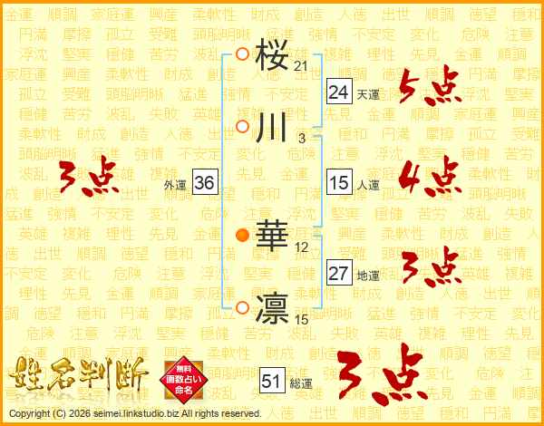 桜(21画)川(3画) 華(12画)凛(15画)