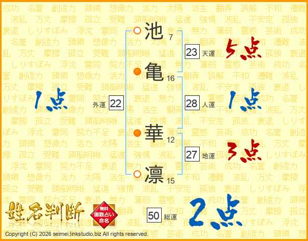池(7画)亀(16画) 華(12画)凛(15画)