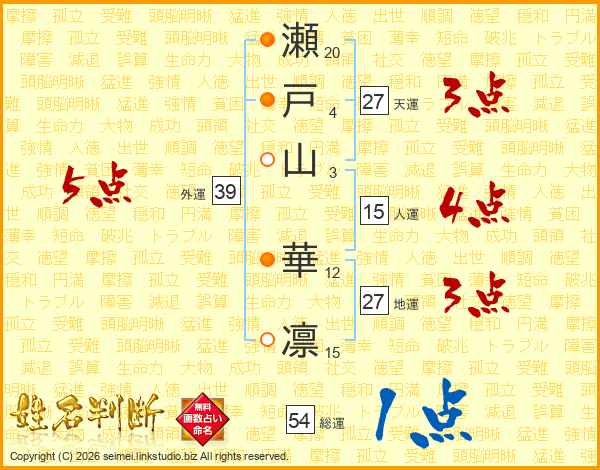 瀬(20画)戸(4画)山(3画) 華(12画)凛(15画)
