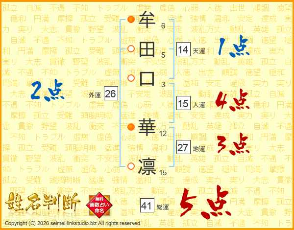 牟(6画)田(5画)口(3画) 華(12画)凛(15画)