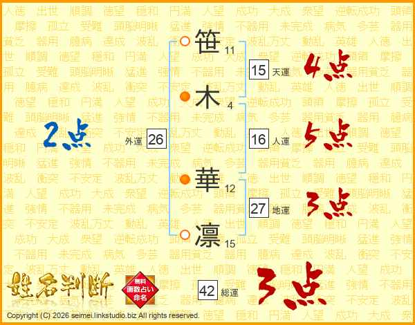 あなたの人生を表す1番重要な運勢です。生涯を通じて影響する総合運となり、主に50歳以降の晩年期に影響を及ぼします。苗字と名前の合計画数。