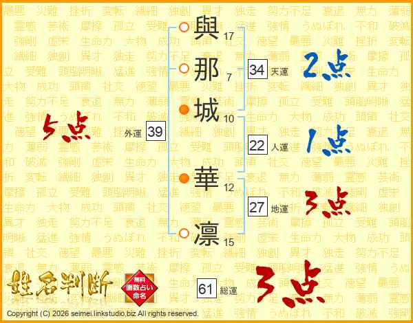 與(17画)那(7画)城(10画) 華(12画)凛(15画)