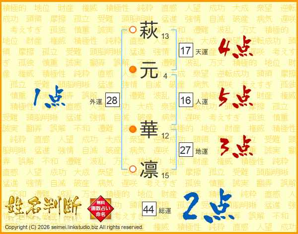 あなたの人生を表す1番重要な運勢です。生涯を通じて影響する総合運となり、主に50歳以降の晩年期に影響を及ぼします。苗字と名前の合計画数。