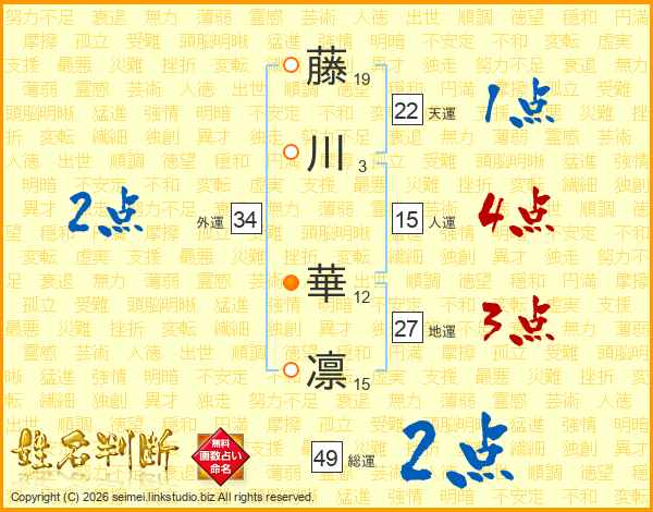 生活面を象徴する運勢です。外部から受ける影響力を表し、結婚運、家庭運や職場、環境への順応性を表します。総運から人運を引いた画数。姓や名が1文字の場合を除く。