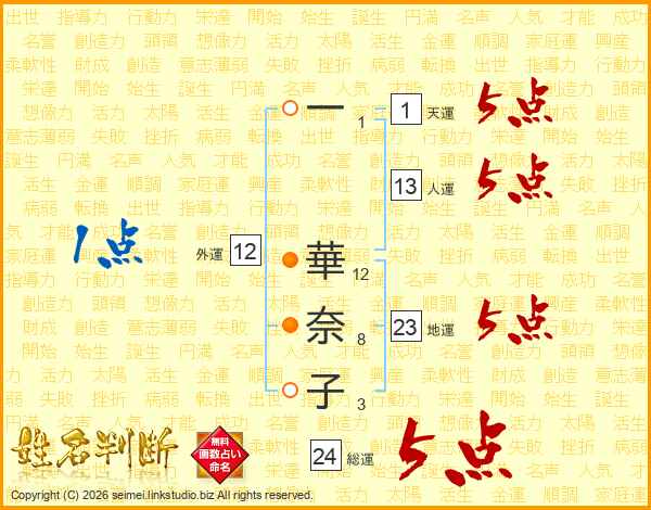 生活面を象徴する運勢です。外部から受ける影響力を表し、結婚運、家庭運や職場、環境への順応性を表します。総運から人運を引いた画数。姓や名が1文字の場合を除く。