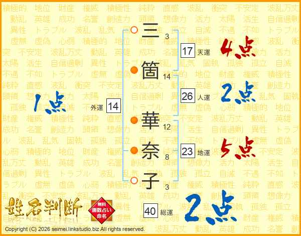 三(3画)箇(14画) 華(12画)奈(8画)子(3画)