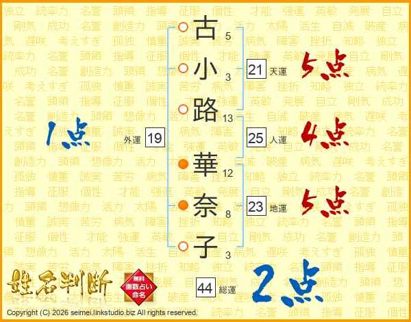 古(5画)小(3画)路(13画) 華(12画)奈(8画)子(3画)