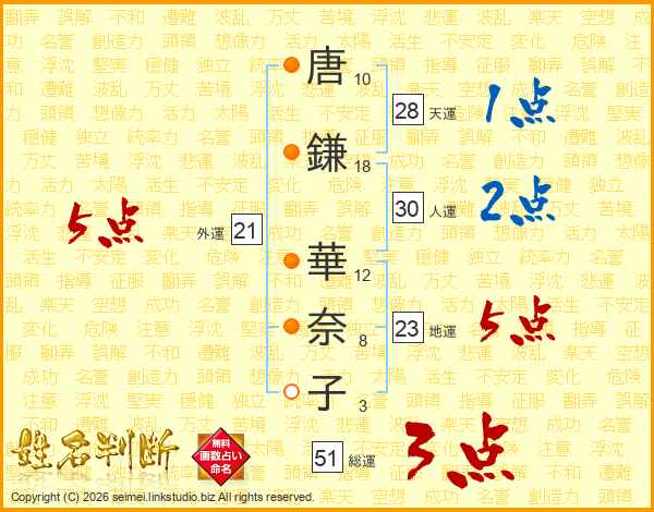 唐(10画)鎌(18画) 華(12画)奈(8画)子(3画)