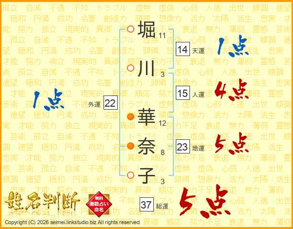 堀(11画)川(3画) 華(12画)奈(8画)子(3画)