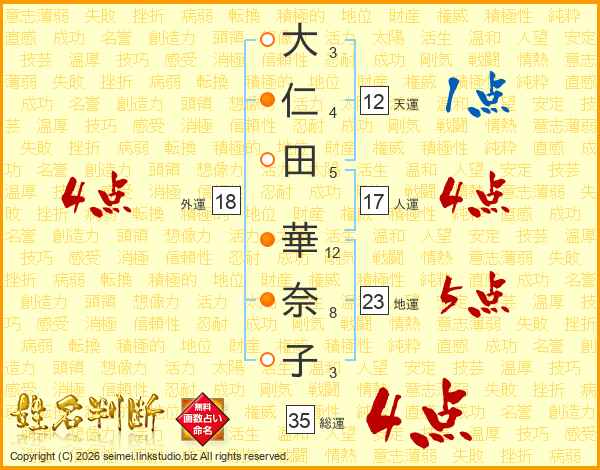 大(3画)仁(4画)田(5画) 華(12画)奈(8画)子(3画)