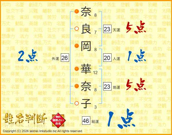 奈(8画)良(7画)岡(8画) 華(12画)奈(8画)子(3画)
