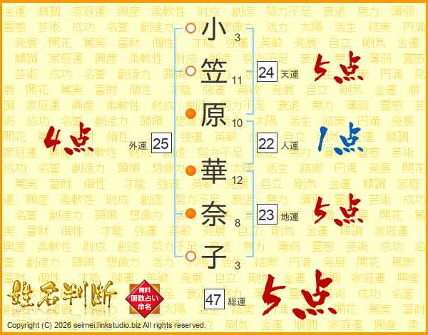 小(3画)笠(11画)原(10画) 華(12画)奈(8画)子(3画)