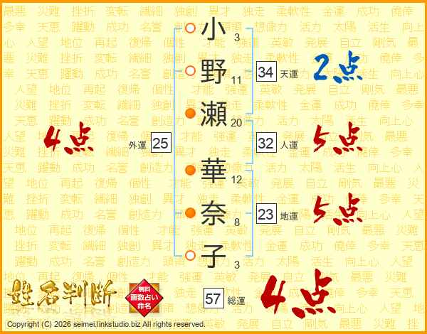 小野瀬華奈子さんの総運は57画の4点!