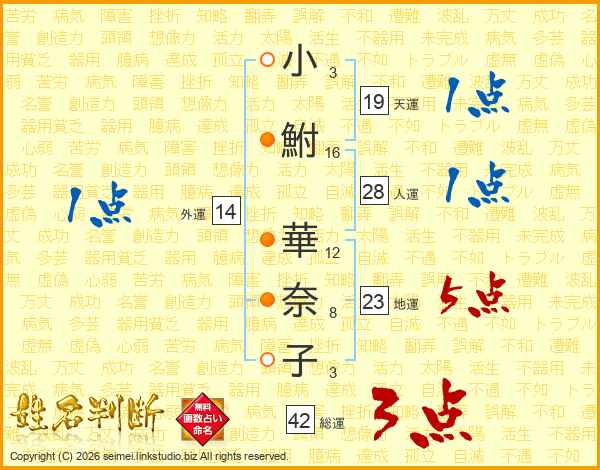 小(3画)鮒(16画) 華(12画)奈(8画)子(3画)