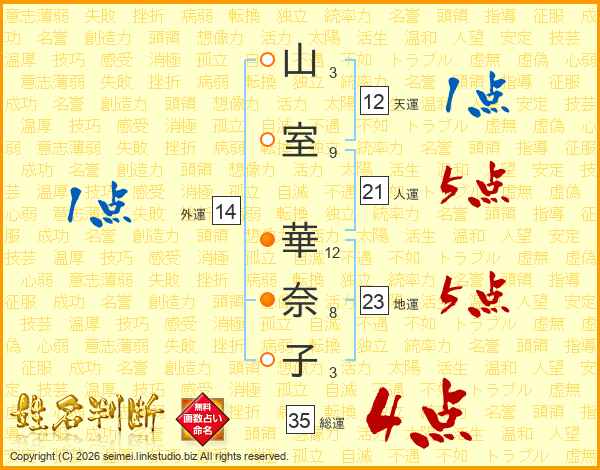 山(3画)室(9画) 華(12画)奈(8画)子(3画)