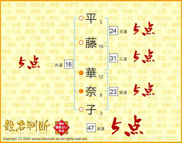 平(5画)藤(19画) 華(12画)奈(8画)子(3画)