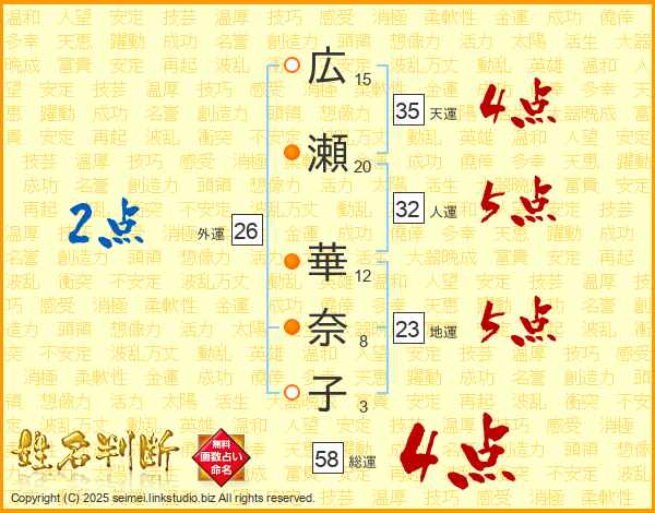 広(15画)瀬(20画) 華(12画)奈(8画)子(3画)