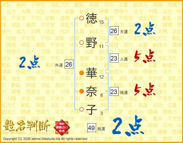 徳(15画)野(11画) 華(12画)奈(8画)子(3画)