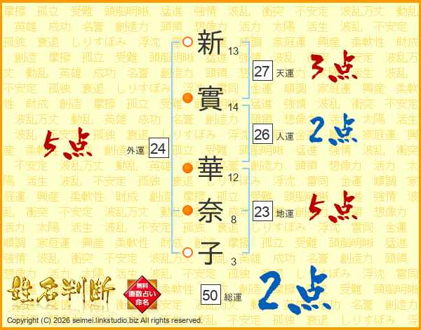 新(13画)實(14画) 華(12画)奈(8画)子(3画)