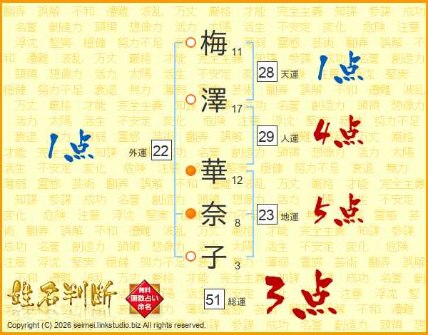 梅(11画)澤(17画) 華(12画)奈(8画)子(3画)