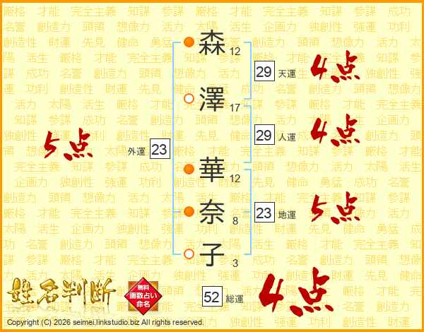 森(12画)澤(17画) 華(12画)奈(8画)子(3画)