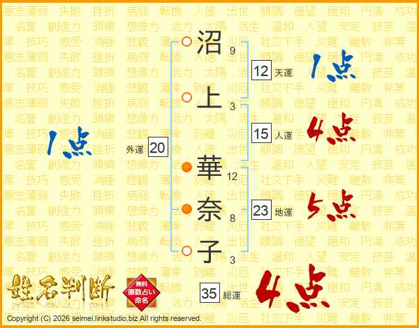 沼(9画)上(3画) 華(12画)奈(8画)子(3画)