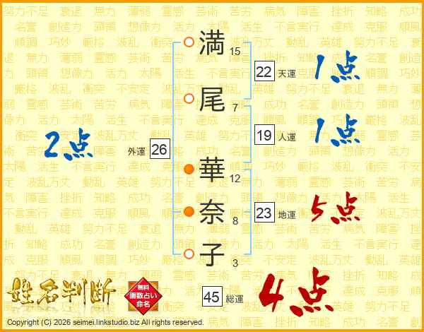 満(15画)尾(7画) 華(12画)奈(8画)子(3画)