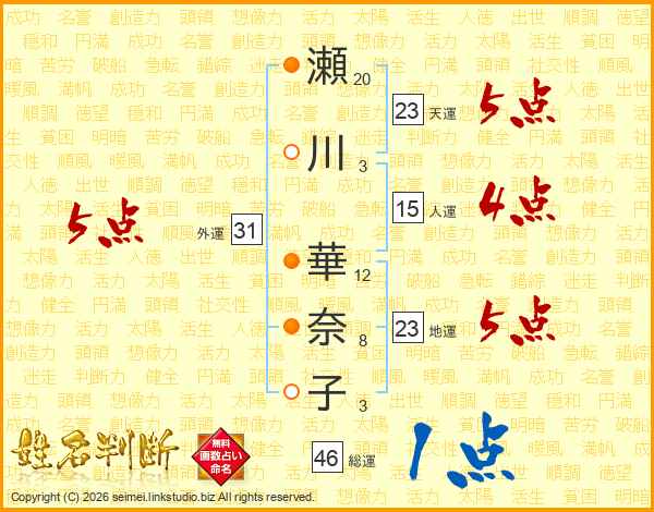 瀬(20画)川(3画) 華(12画)奈(8画)子(3画)