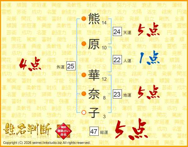 熊(14画)原(10画) 華(12画)奈(8画)子(3画)