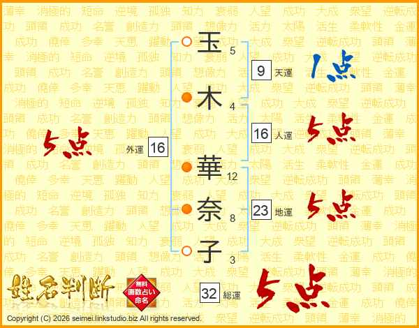 玉(5画)木(4画) 華(12画)奈(8画)子(3画)