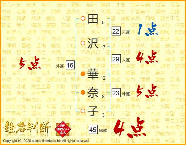 田(5画)沢(17画) 華(12画)奈(8画)子(3画)