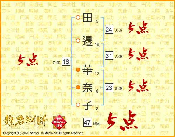 田(5画)邉(19画) 華(12画)奈(8画)子(3画)