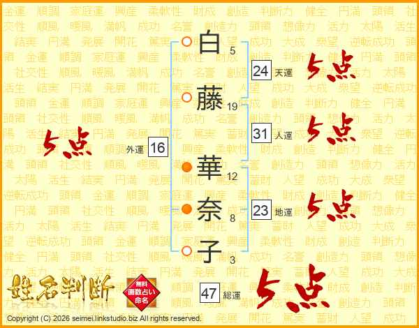 白(5画)藤(19画) 華(12画)奈(8画)子(3画)