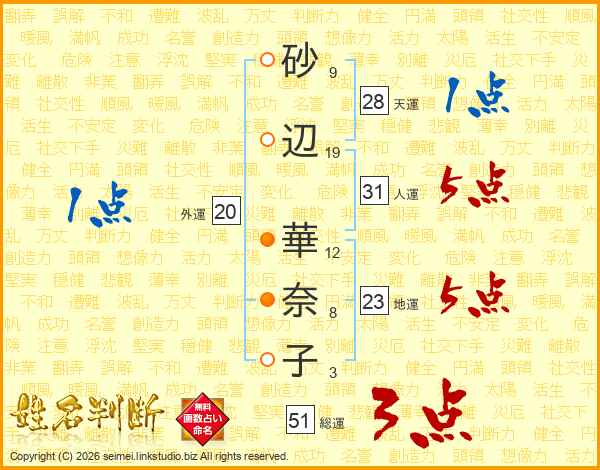 砂(9画)辺(19画) 華(12画)奈(8画)子(3画)