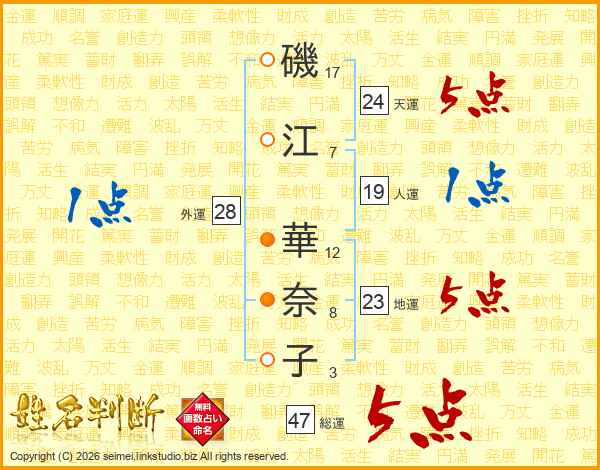 磯(17画)江(7画) 華(12画)奈(8画)子(3画)