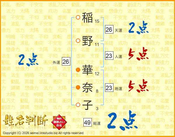 稲(15画)野(11画) 華(12画)奈(8画)子(3画)