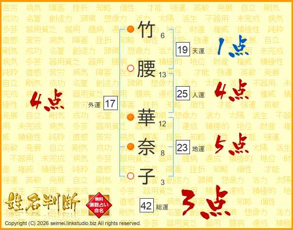 竹(6画)腰(13画) 華(12画)奈(8画)子(3画)