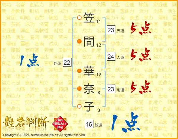 笠間華奈子さんの人運は24画の5点!