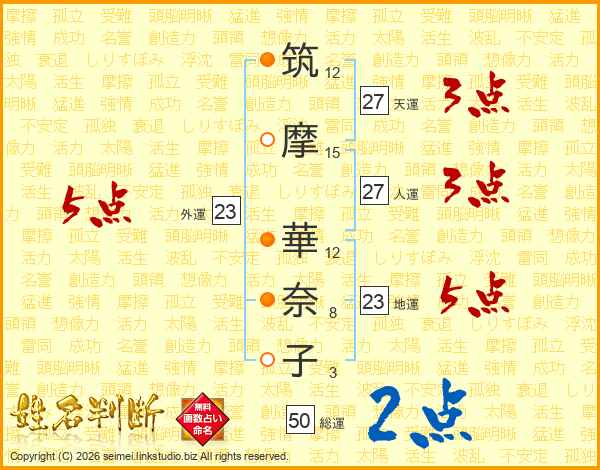 筑(12画)摩(15画) 華(12画)奈(8画)子(3画)